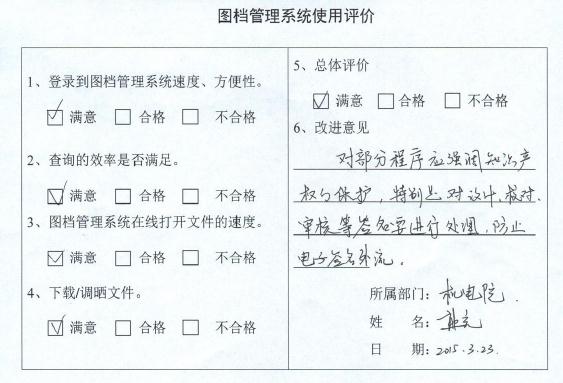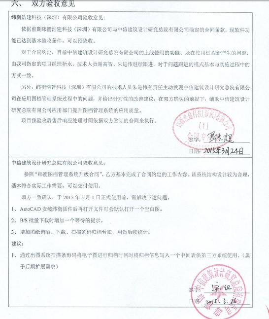 2014年9月緯衡浩建科技(深圳)有限公司與中信建筑設計研究總院有限公司簽訂《緯衡智能圖文VHDrawings軟件 V5.0、緯衡出圖管理VHPlot軟件V2.0軟件購買及升級合同》,雙方積極協作開展圖檔管理系統的部署實施工作,該系統于2014年11月開始試運 行,2015年1月正式運行。 2015年3月25日,中信建筑設計研究院有限公司對緯衡科技提供的圖檔管理系統進行組織驗收,驗收分為功能驗收和使用效果驗收兩部分,參與驗收的人員包 括信息中心技術專家以及生產院的設計人員(兩個院總計約100余人)。經過信息中心技術專業的把關以及設計人員的反饋一致認為圖檔系統可以通過驗收。